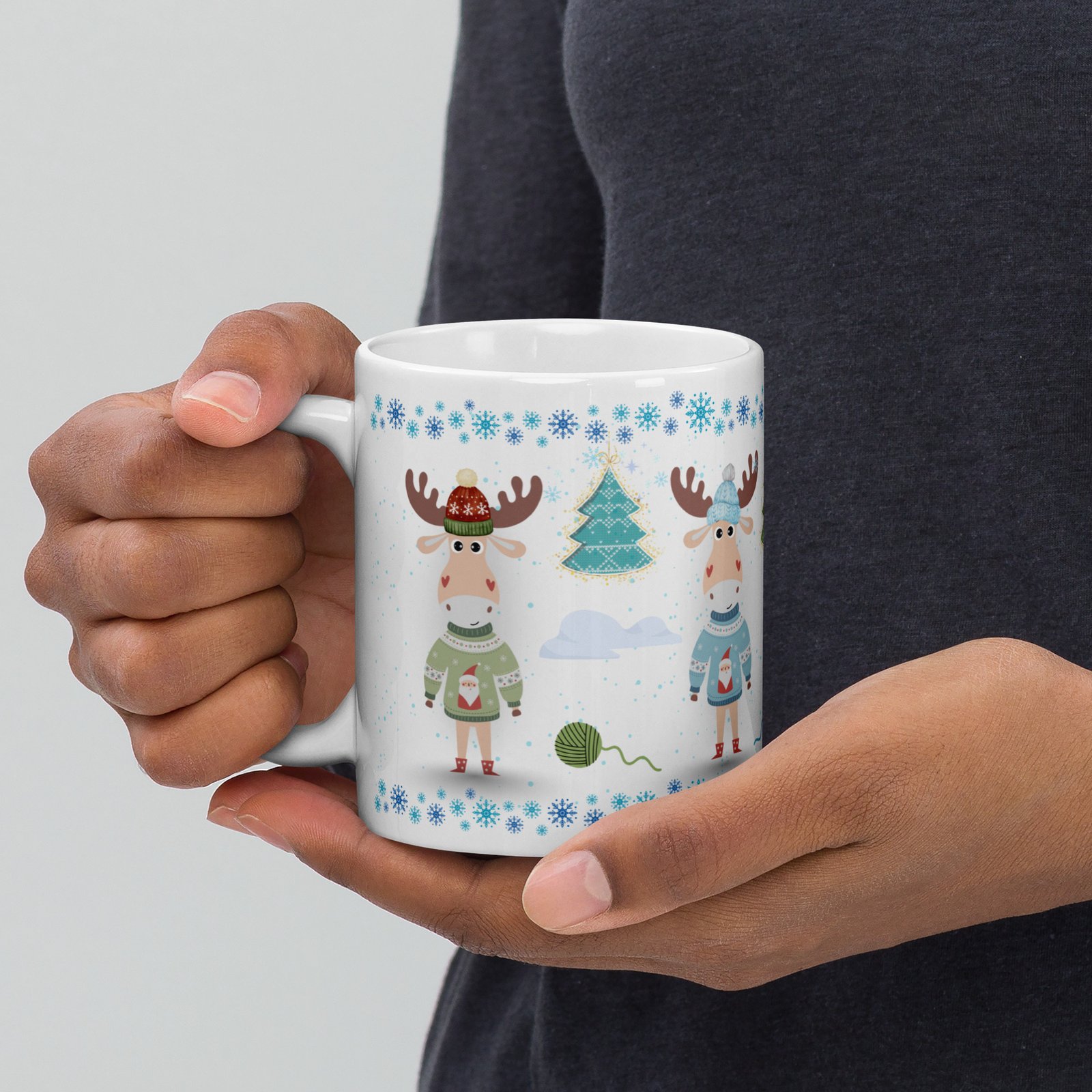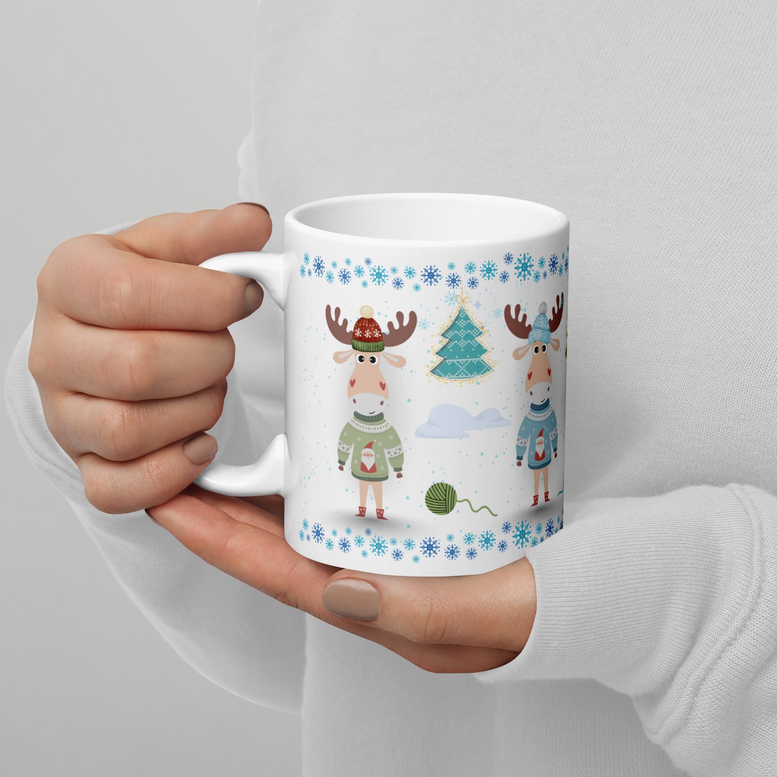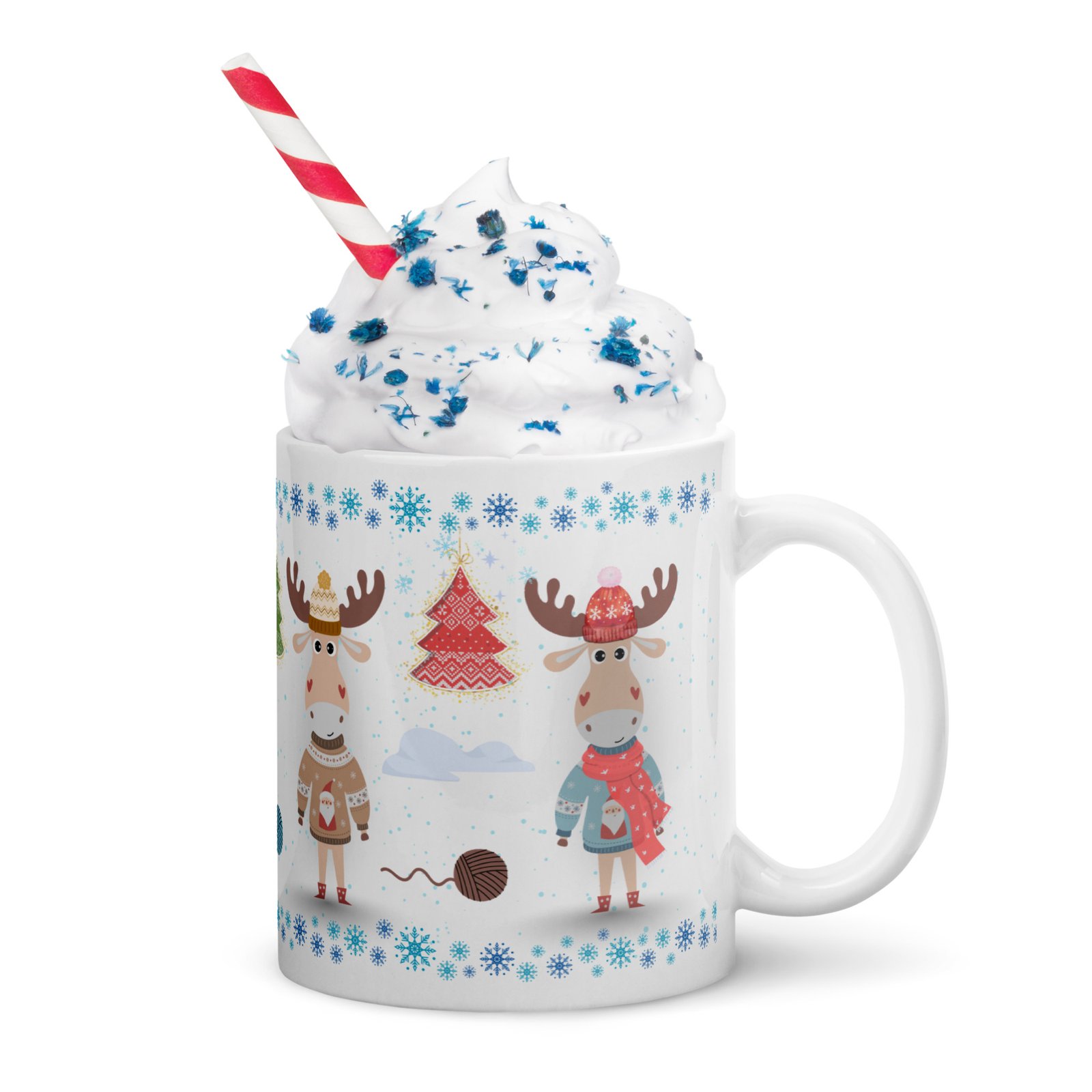 Meet our Christmas Reindeer Mug — a joyful Scandinavian-inspired design featuring a family of reindeer in knitted sweaters and pompom hats, surrounded by snowflakes and holiday trees.