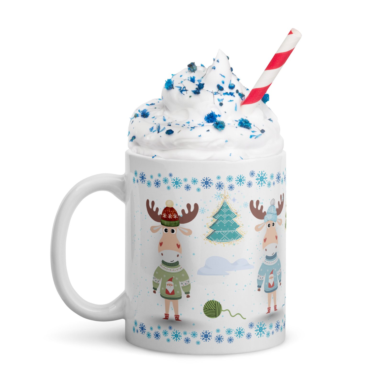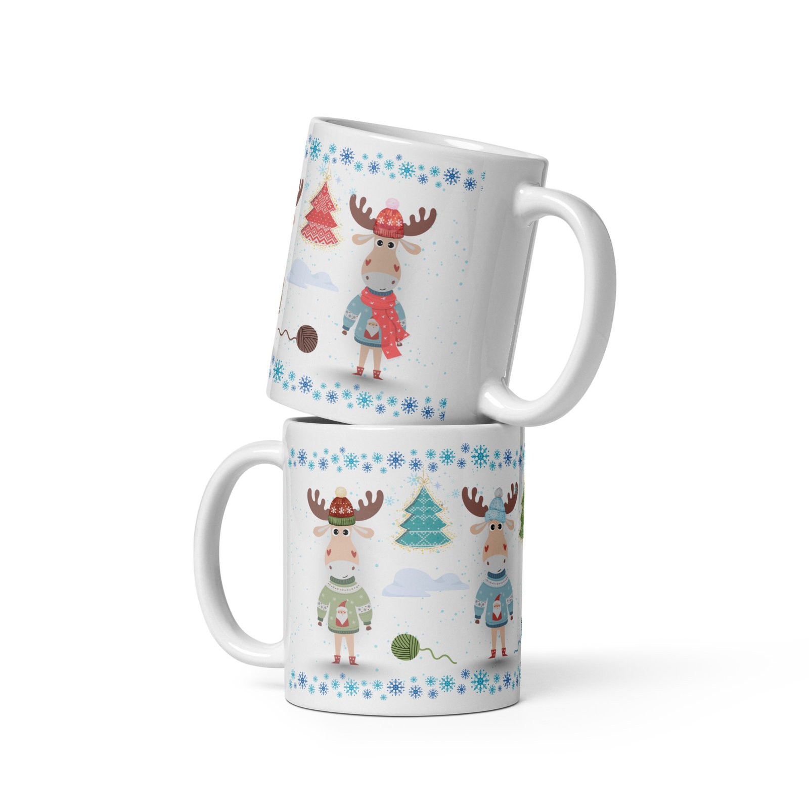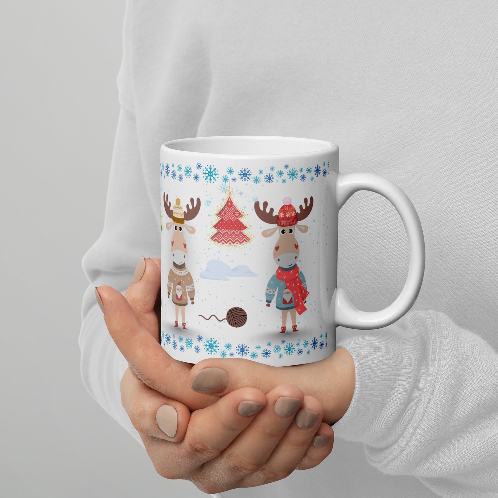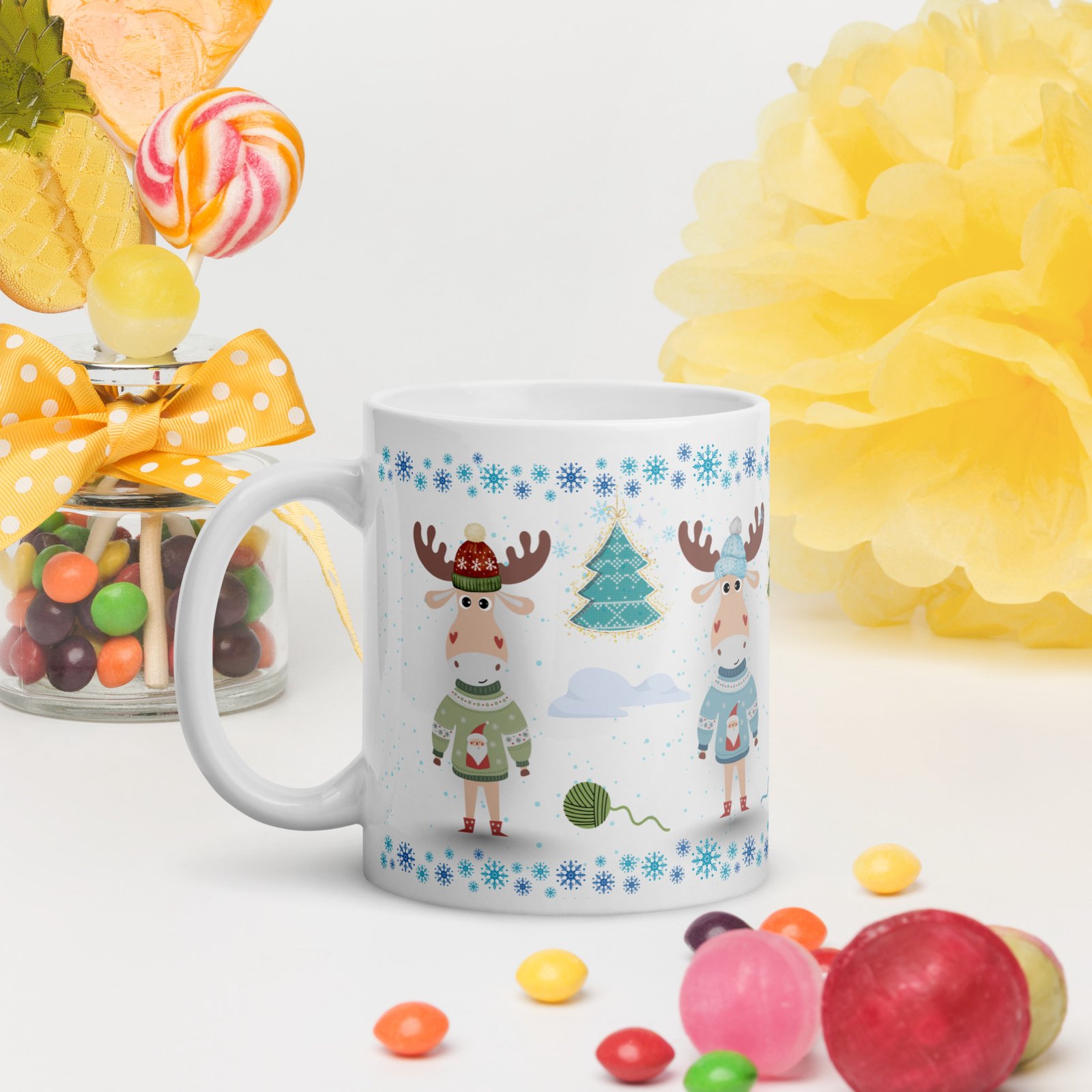 Meet our Christmas Reindeer Mug — a joyful Scandinavian-inspired design featuring a family of reindeer in knitted sweaters and pompom hats, surrounded by snowflakes and holiday trees.