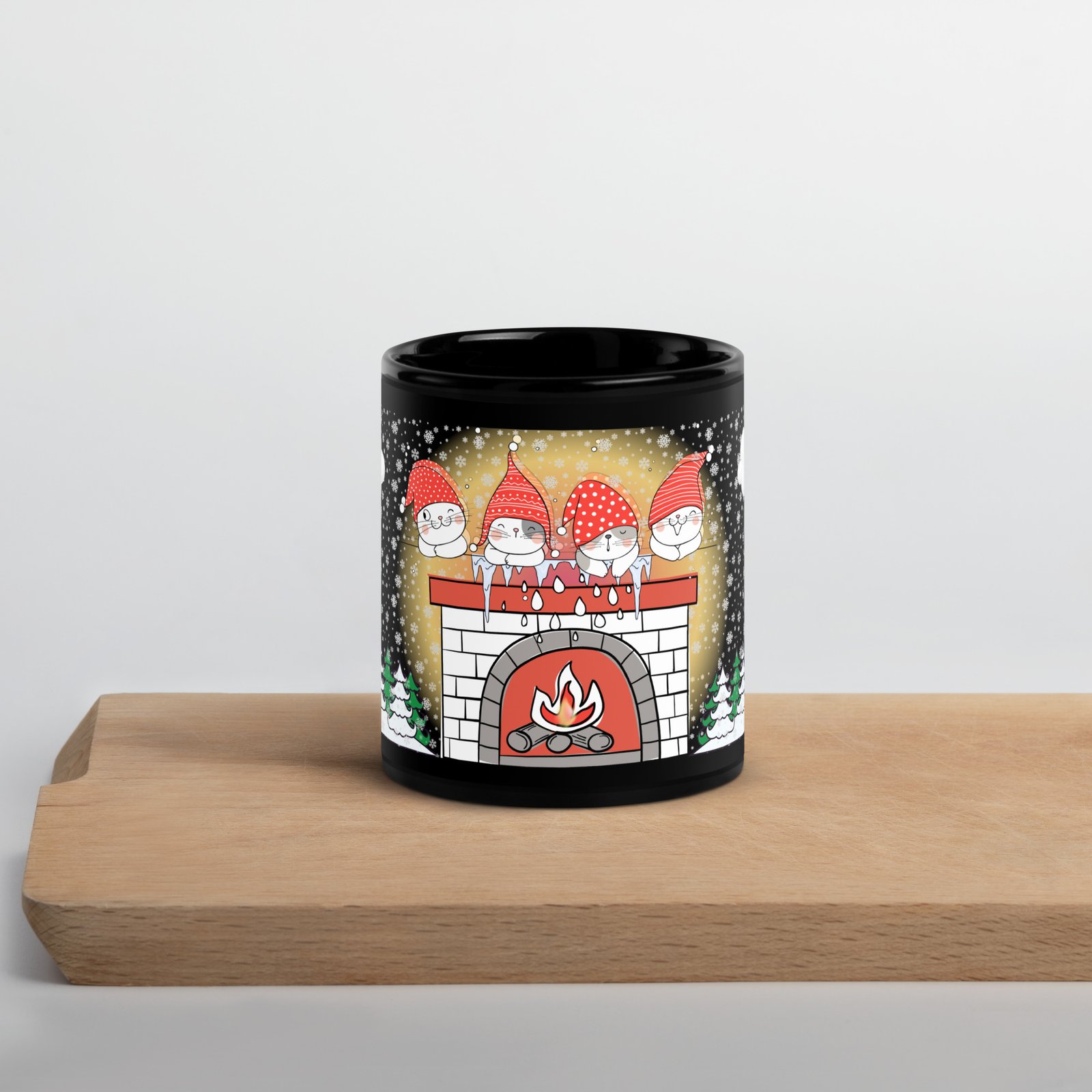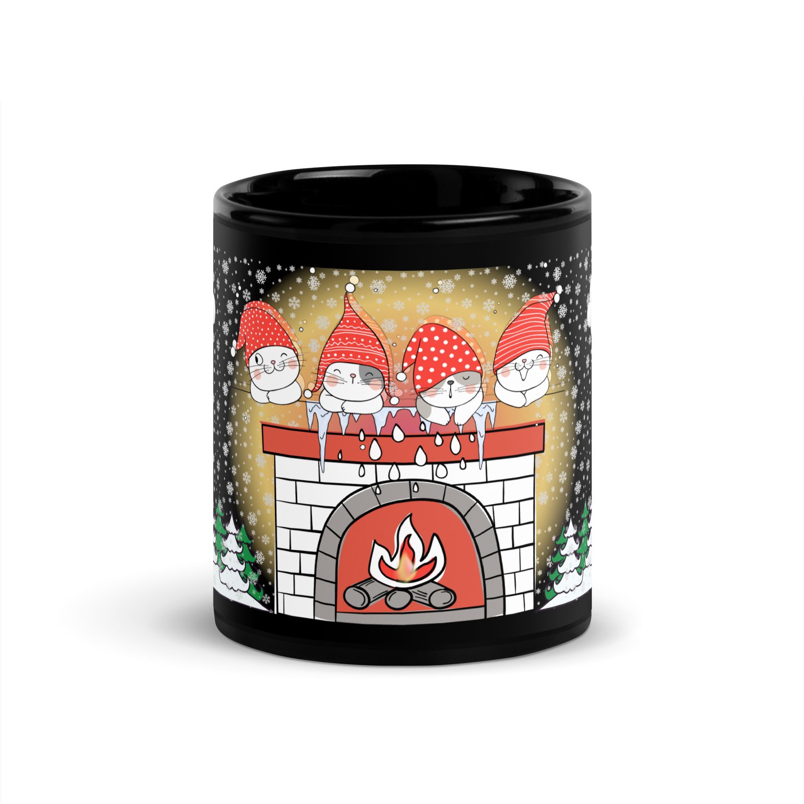 This adorable Christmas mug features four cozy cats in festive hats, resting by a glowing fireplace.