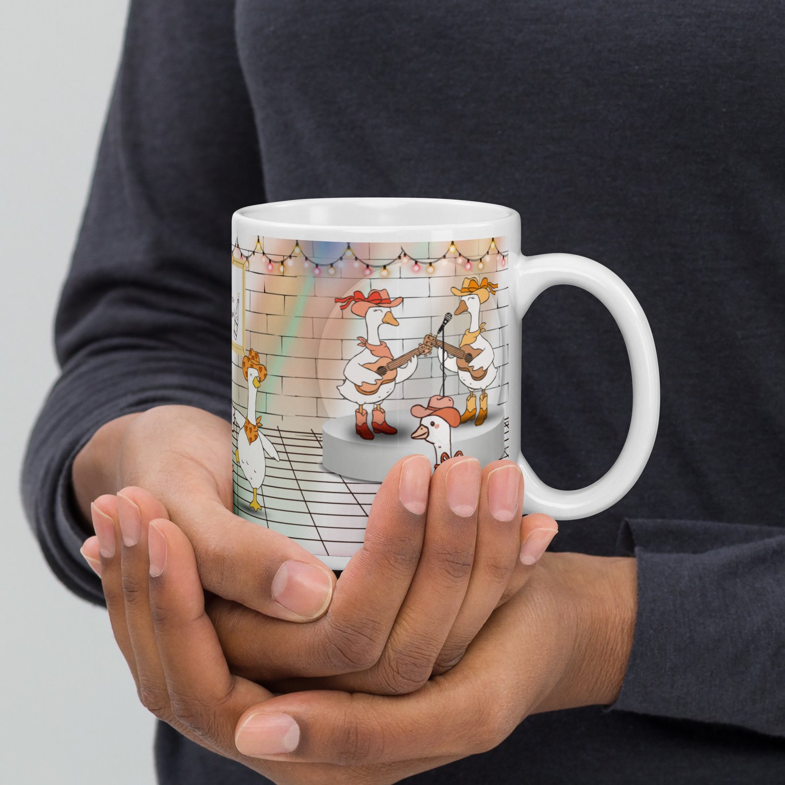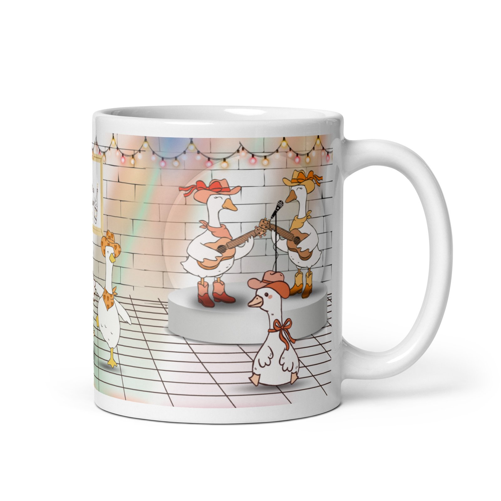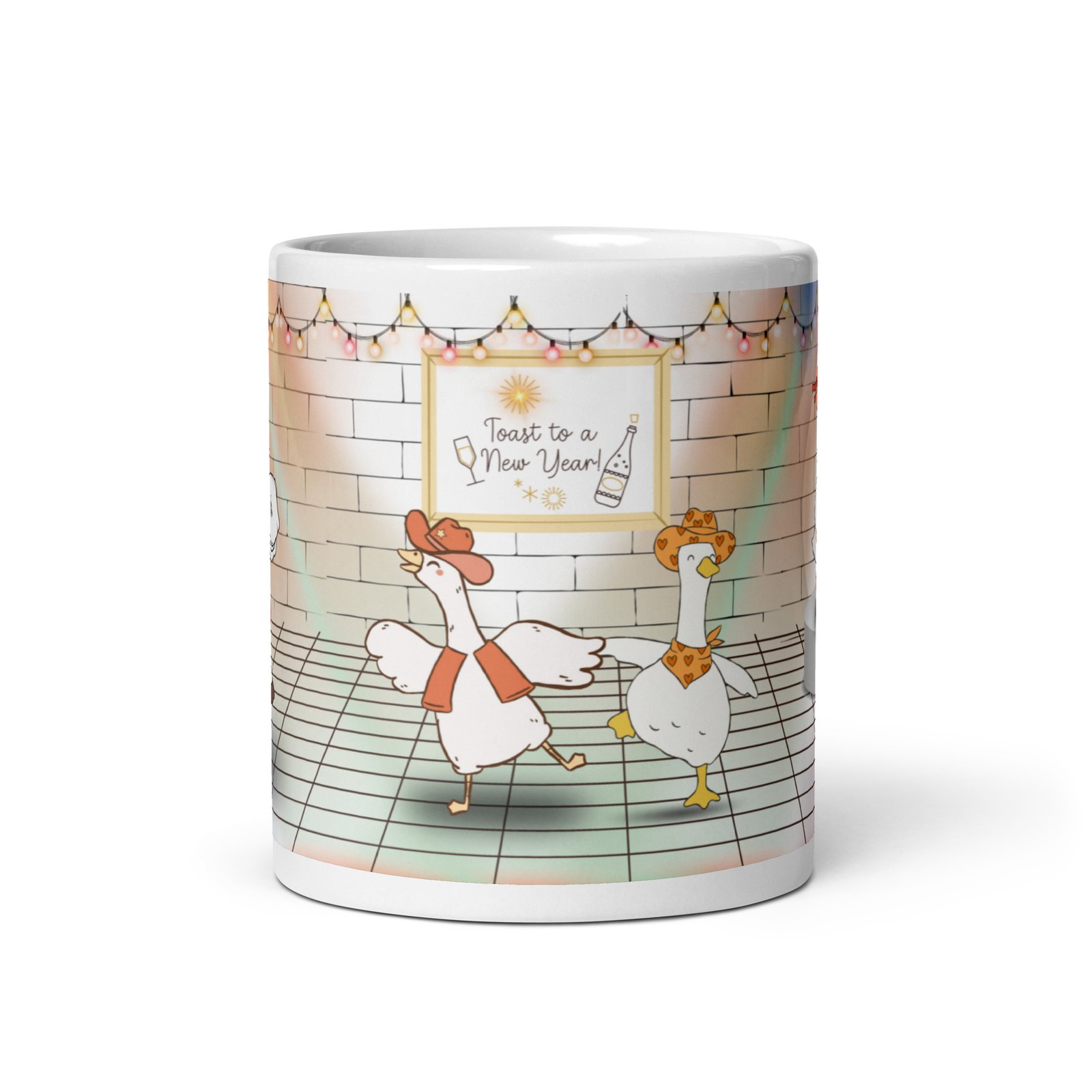 Original artwork: cheerful cowboy geese dancing and toasting under festive string lights.