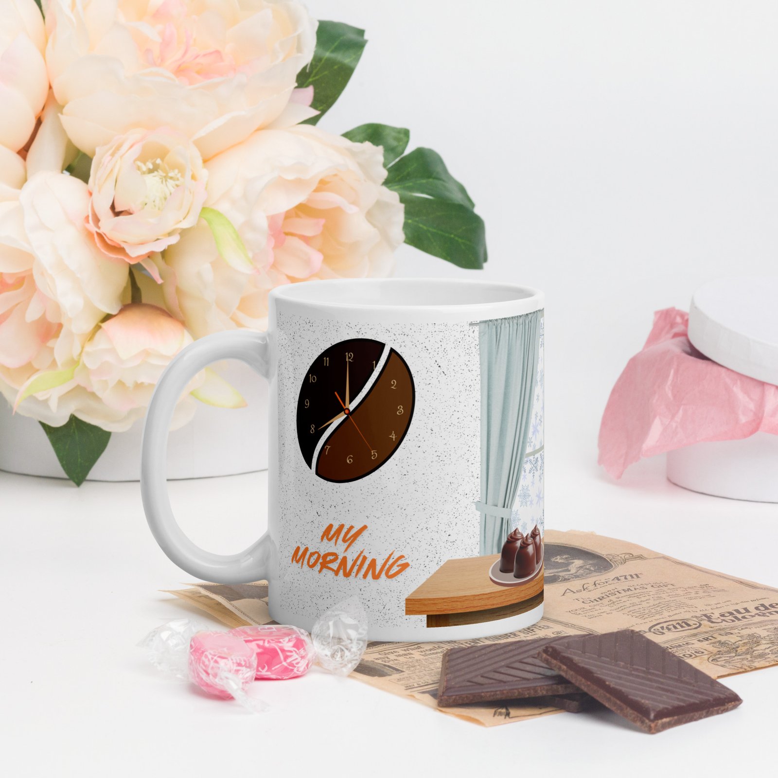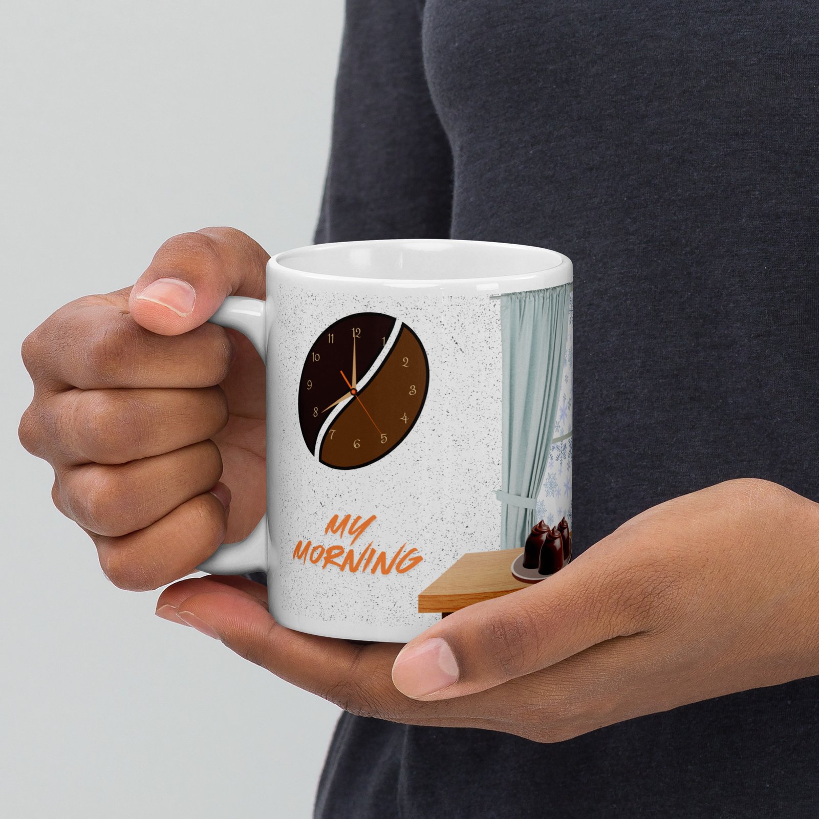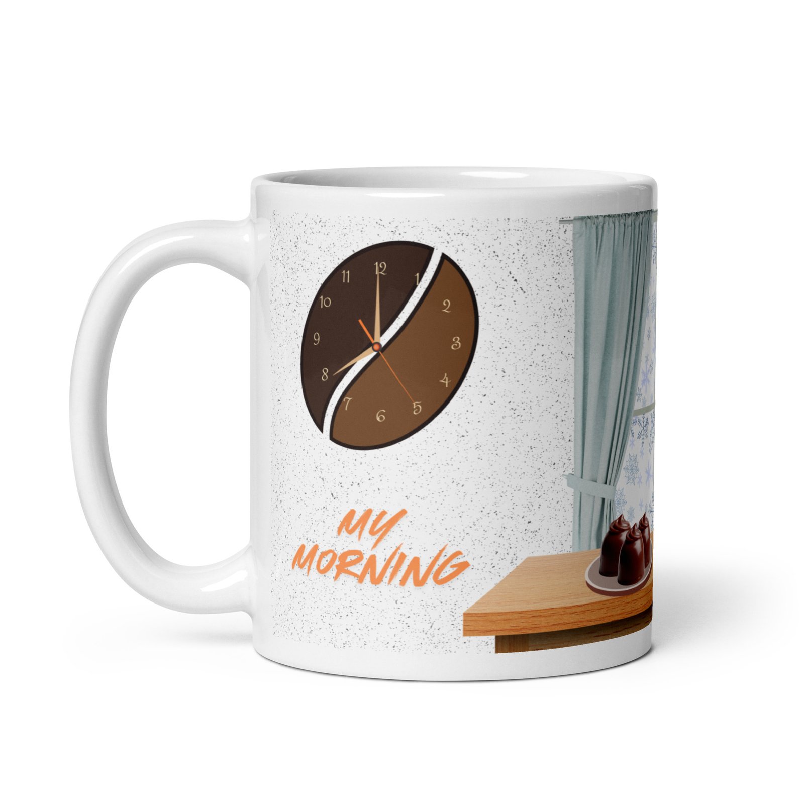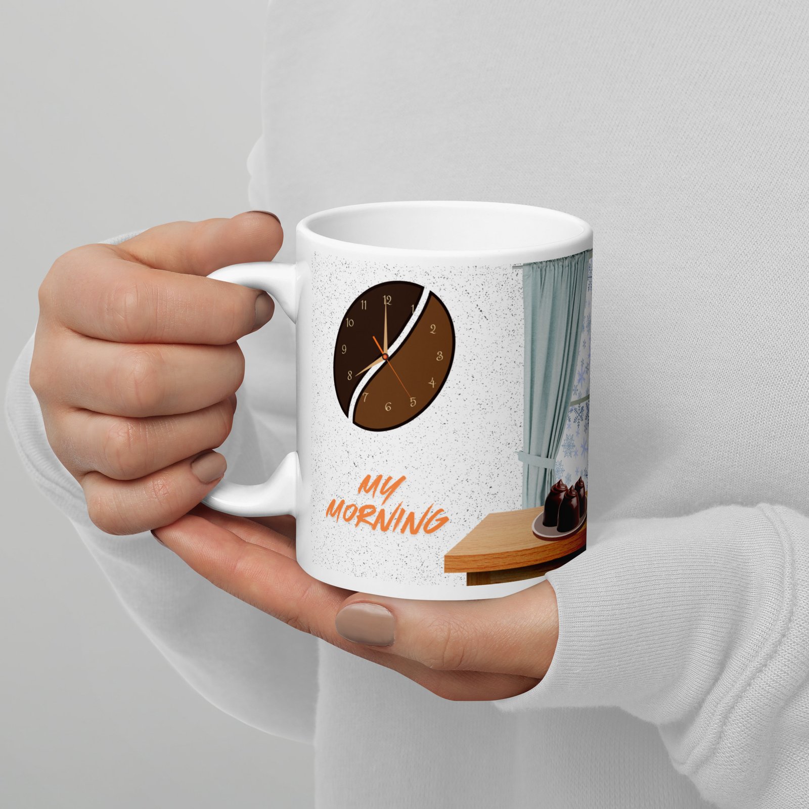 Этот дизайн кружки «Моё утро» воплощает тихую радость зимнего утра — снег за окном, мягкий свет занавесок и чашечку любимого кофе, ожидающую на столе.
