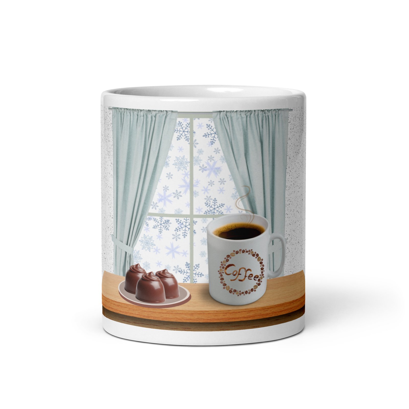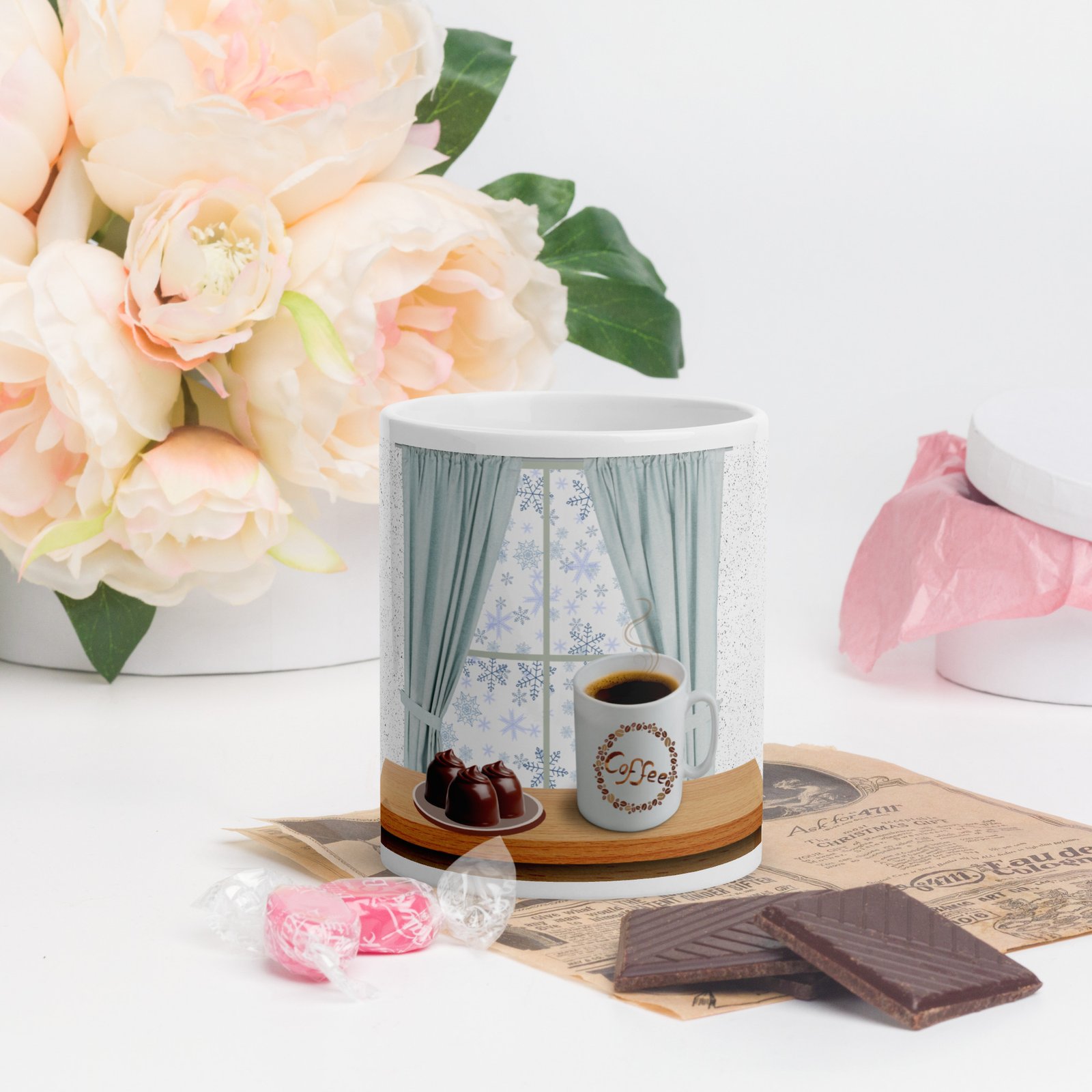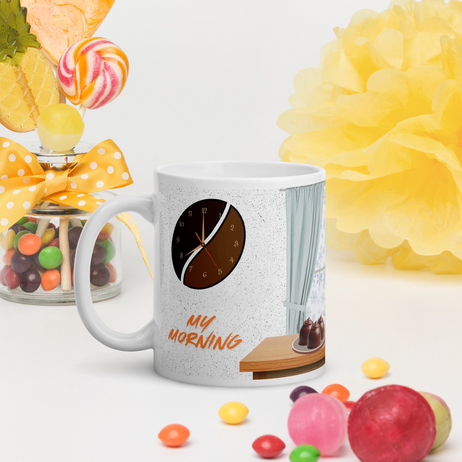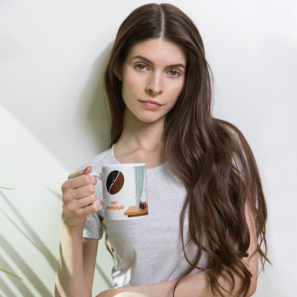 Этот дизайн кружки «Моё утро» воплощает тихую радость зимнего утра — снег за окном, мягкий свет занавесок и чашечку любимого кофе, ожидающую на столе.