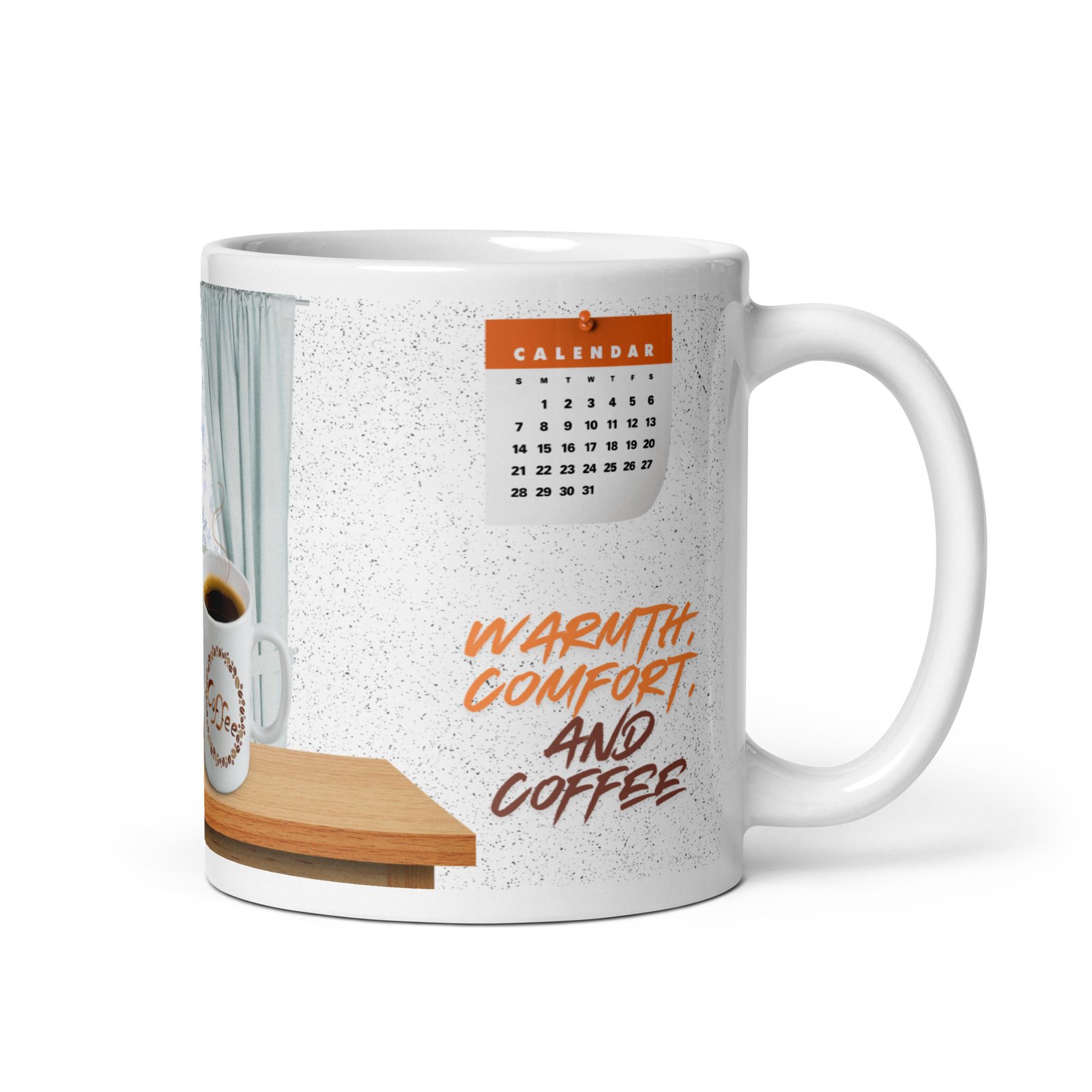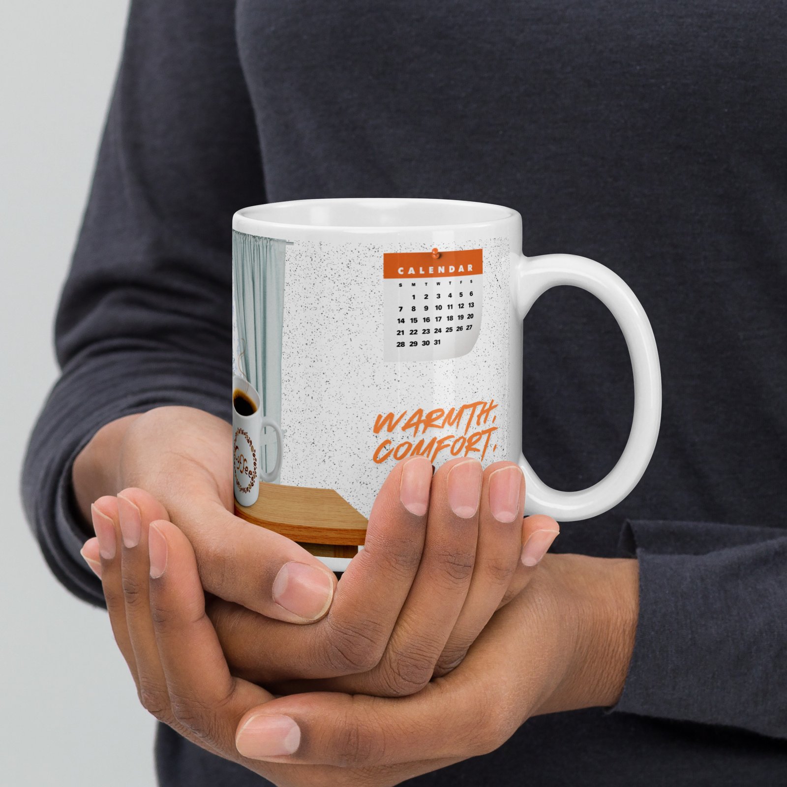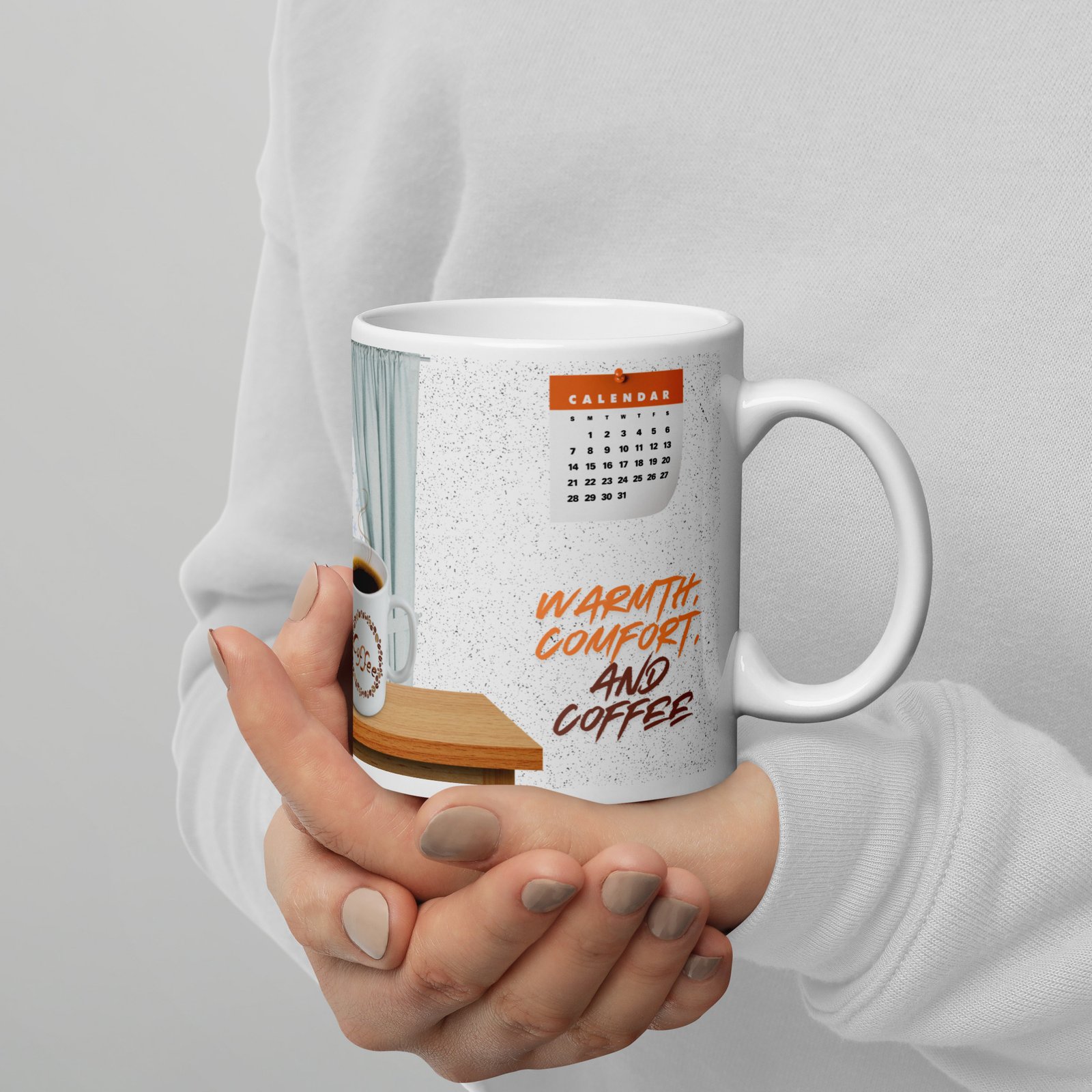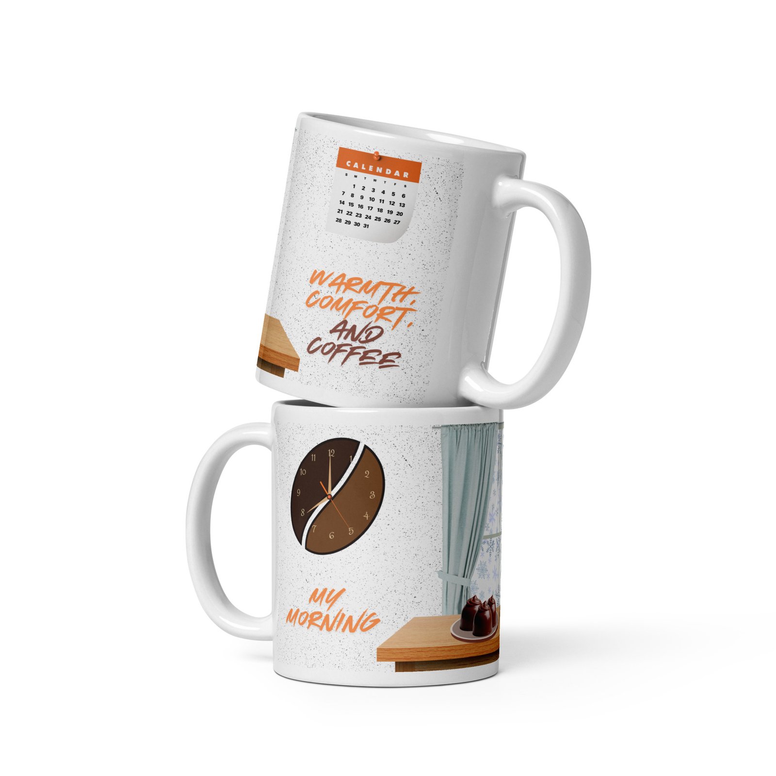 Этот дизайн кружки «Моё утро» воплощает тихую радость зимнего утра — снег за окном, мягкий свет занавесок и чашечку любимого кофе, ожидающую на столе.